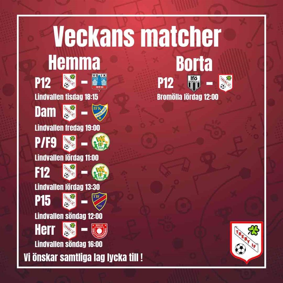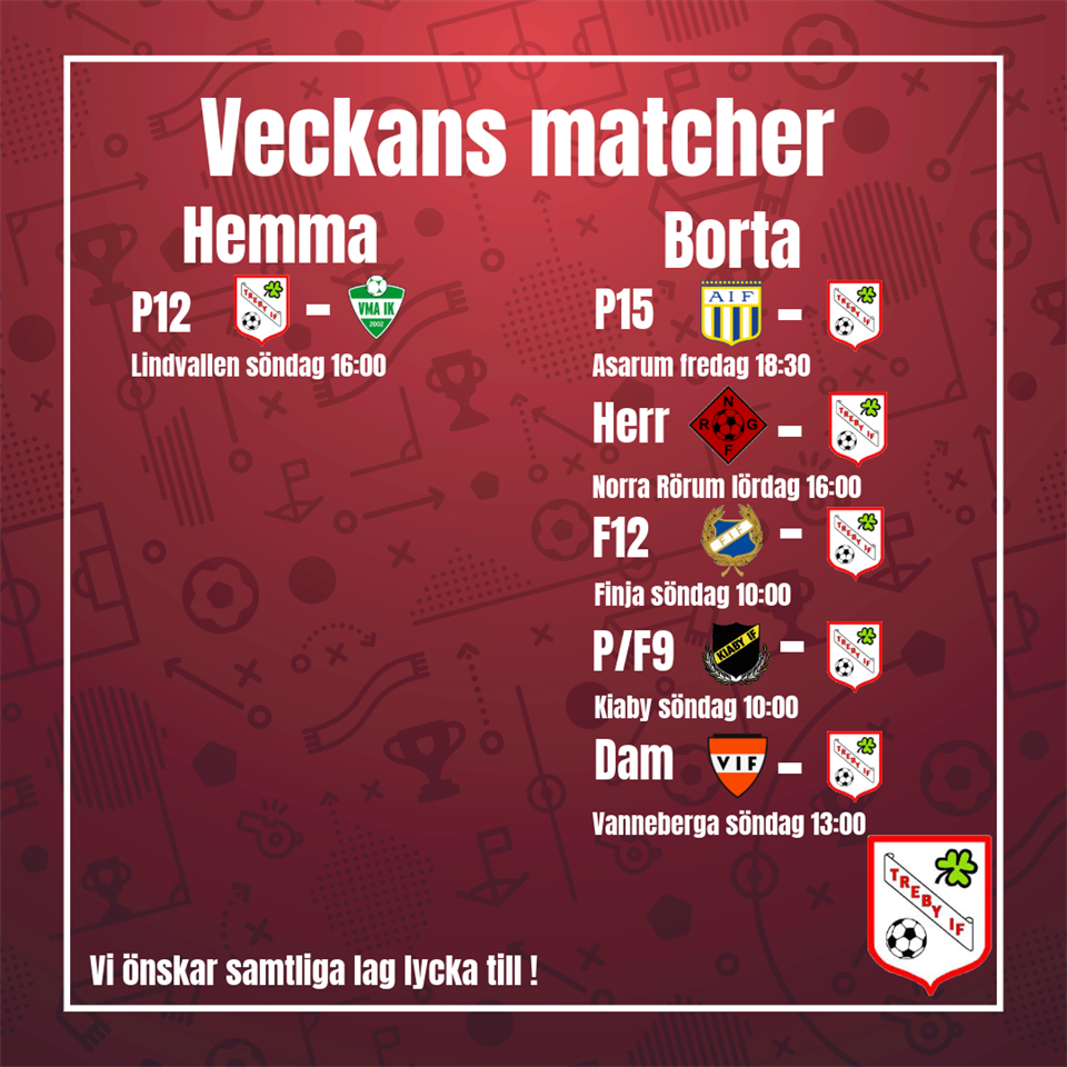 Här kommer veckans matcher. Det börjar dra sig mot slutet av säsongen och herrarna spelar sin sista match borta mot Norra Rörum på lördag, för övriga lag spelas den sista omgången under nästa vecka. Treby IF 30 sep 2025 0kommentarer